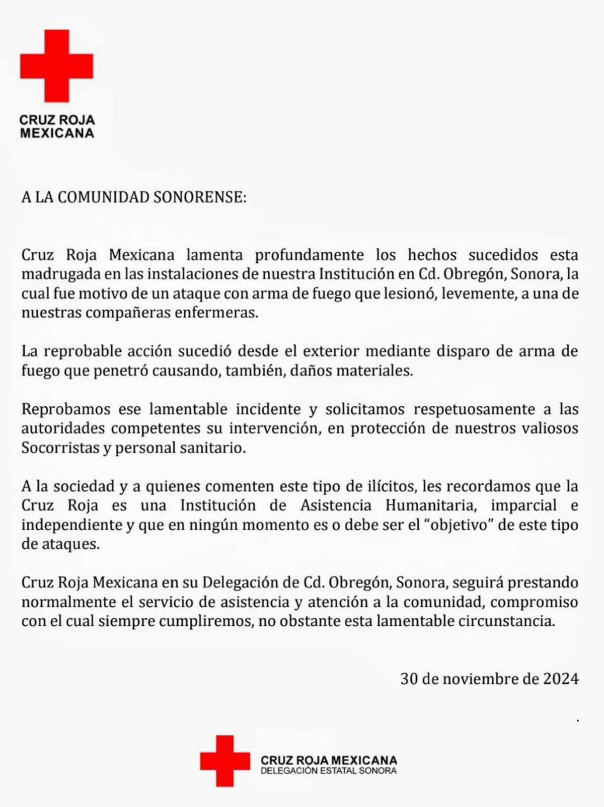 A través de un comunicado, la Cruz Roja de Ciudad Obregón expresó su profundo pesar por el ataque armado a sus instalaciones y las lesiones, aunque menores, que sufrió una de sus paramédicas.