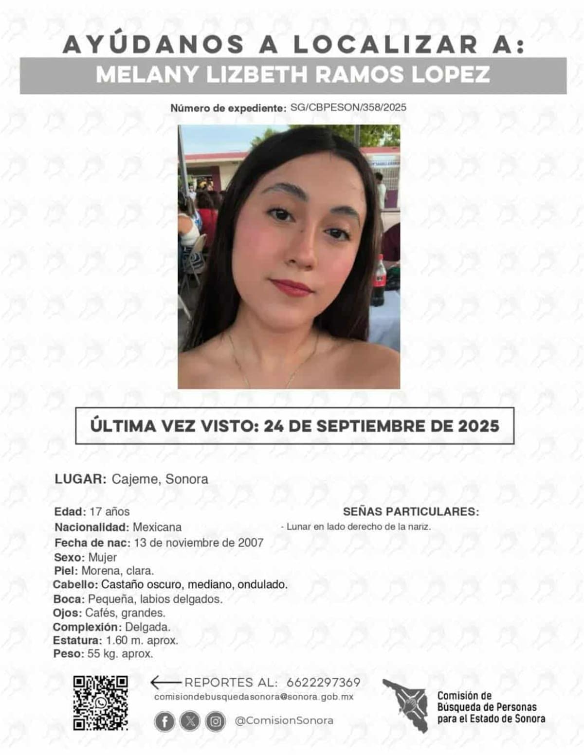CIUDAD OBREGÓN, Sonora. — Autoridades y familiares solicitan la colaboración de la ciudadanía para localizar a Melany Lizeth Ramos López, de 17 años, quien se encuentra desaparecida desde el pasado 24 de septiembre en Ciudad Obregón.