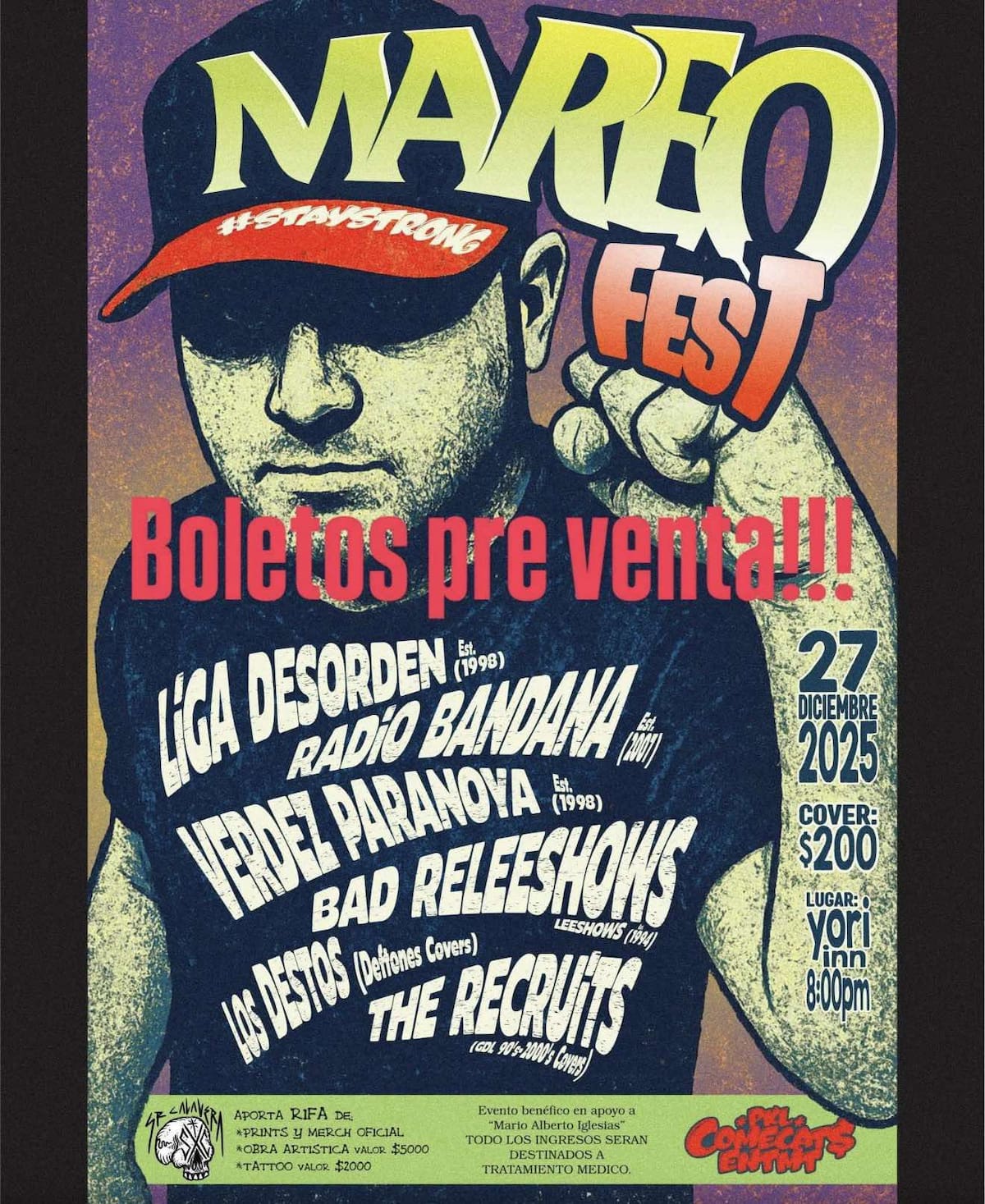 Para saber: El “Mareo Fest” se realizará el próximo 27 de diciembre en el Hotel Yori Inn; el costo de entrada será de 200 pesos. Lo recaudado será en beneficio de Mario. Si desea adquirir un boleto puede hacerlo al 6441140374.