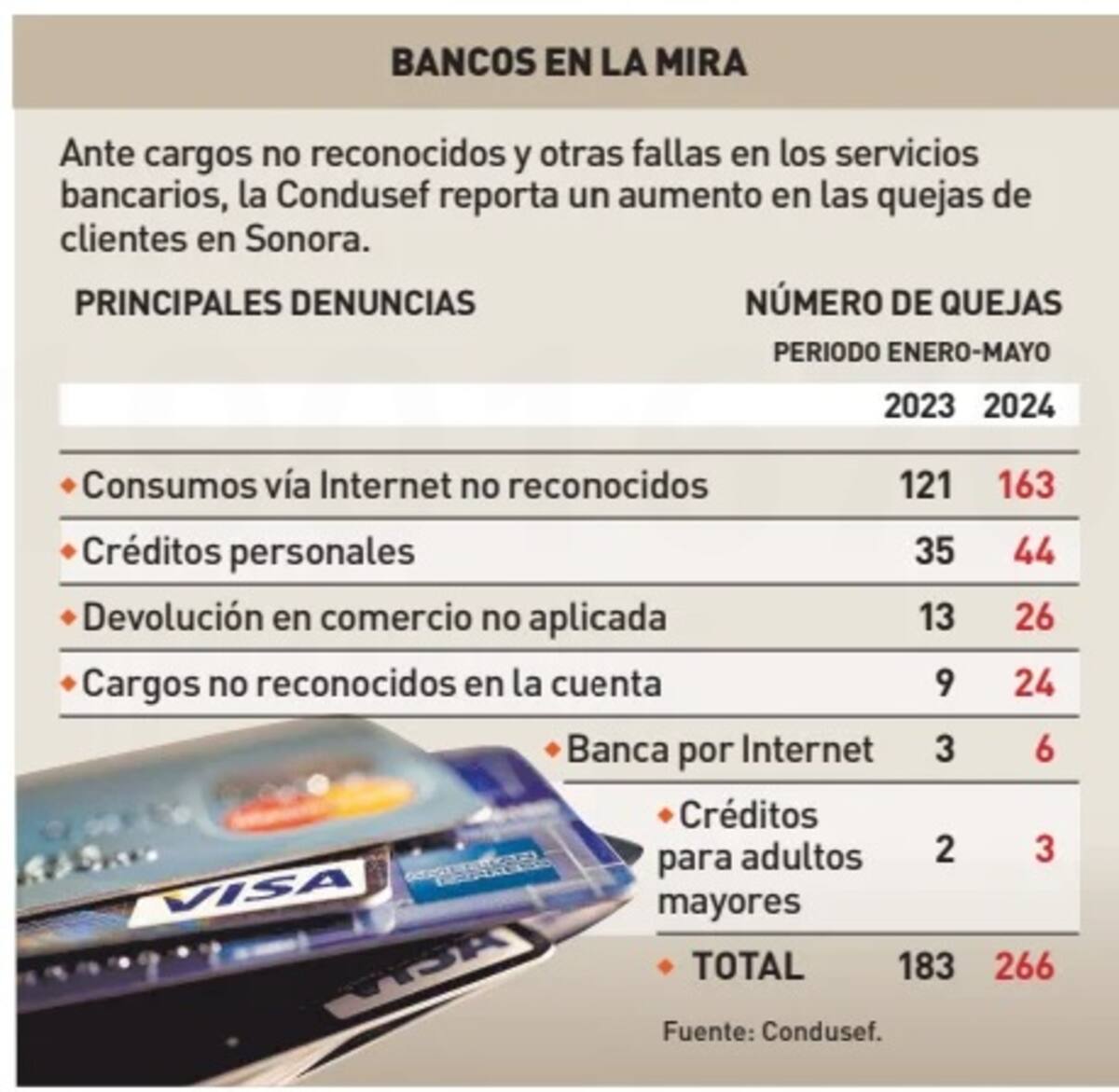 HERMOSILLO, Sonora.- En 45.3% aumentaron las controversias de los clientes bancarios en Sonora en la Condusef, de enero a mayo de 2024 con relación al mismo periodo de 2023, al pasar de 183 quejas a 266.