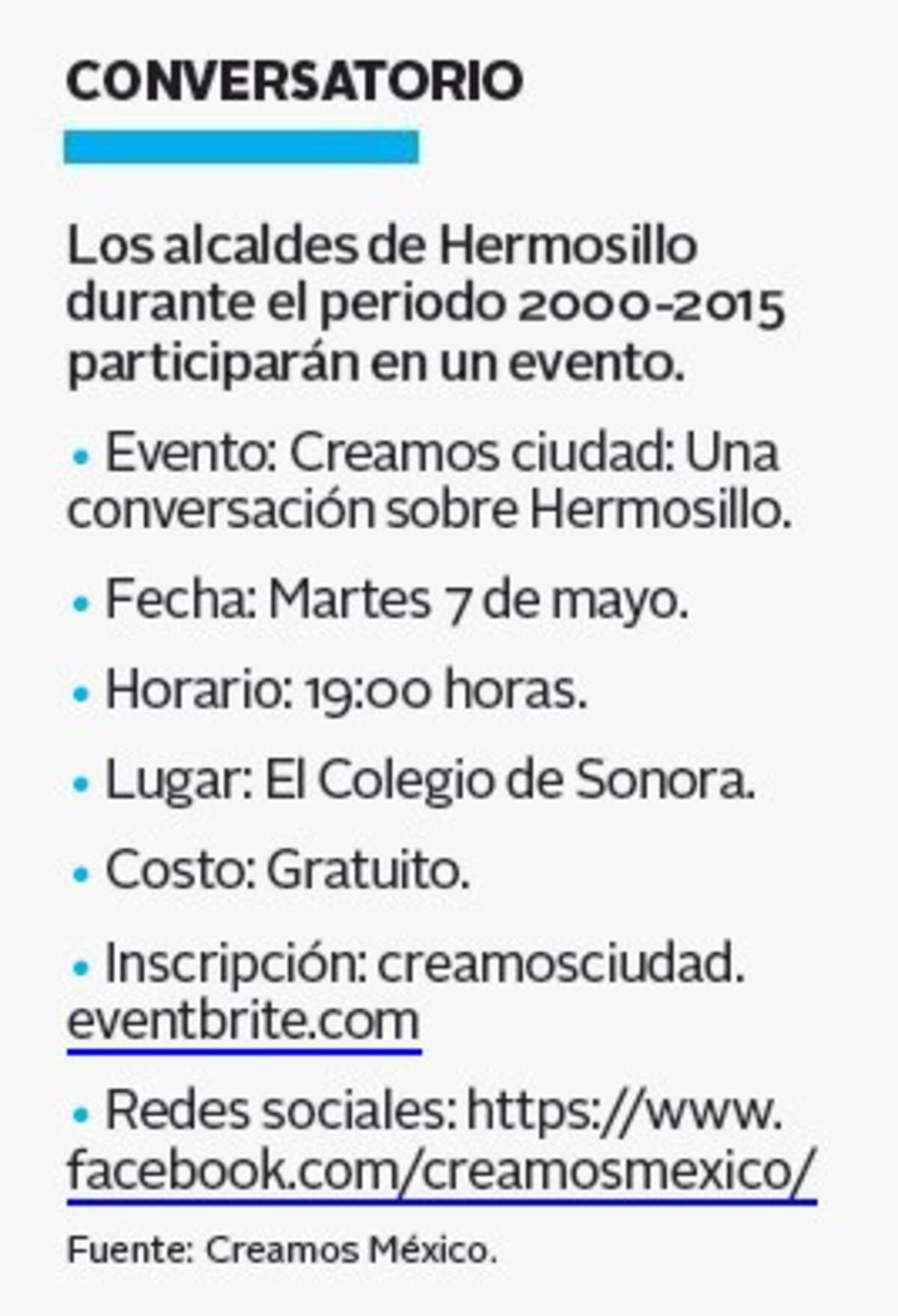 La cita es en las instalaciones de El Colegio de Sonora, agregó, el martes 7 de mayo a las 19:00 horas y la entrada será gratuita previo registro en la página del evento: creamosciudad.eventbrite.com.