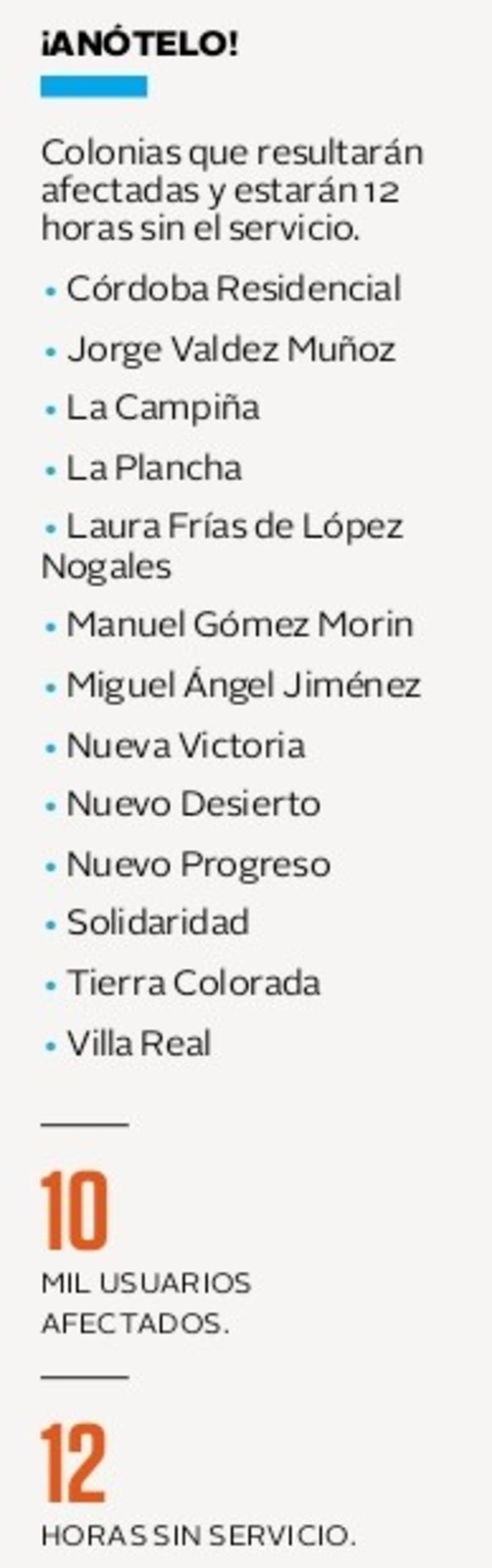 Jesús Dorado Huitrón, coordinador Operativo de Ingeniería de Agua de Hermosillo, indicó que los trabajos de interconexión iniciarán a las 08:00 horas y podrían durar alrededor de 12 horas afectando a casi 10 mil usuarios.