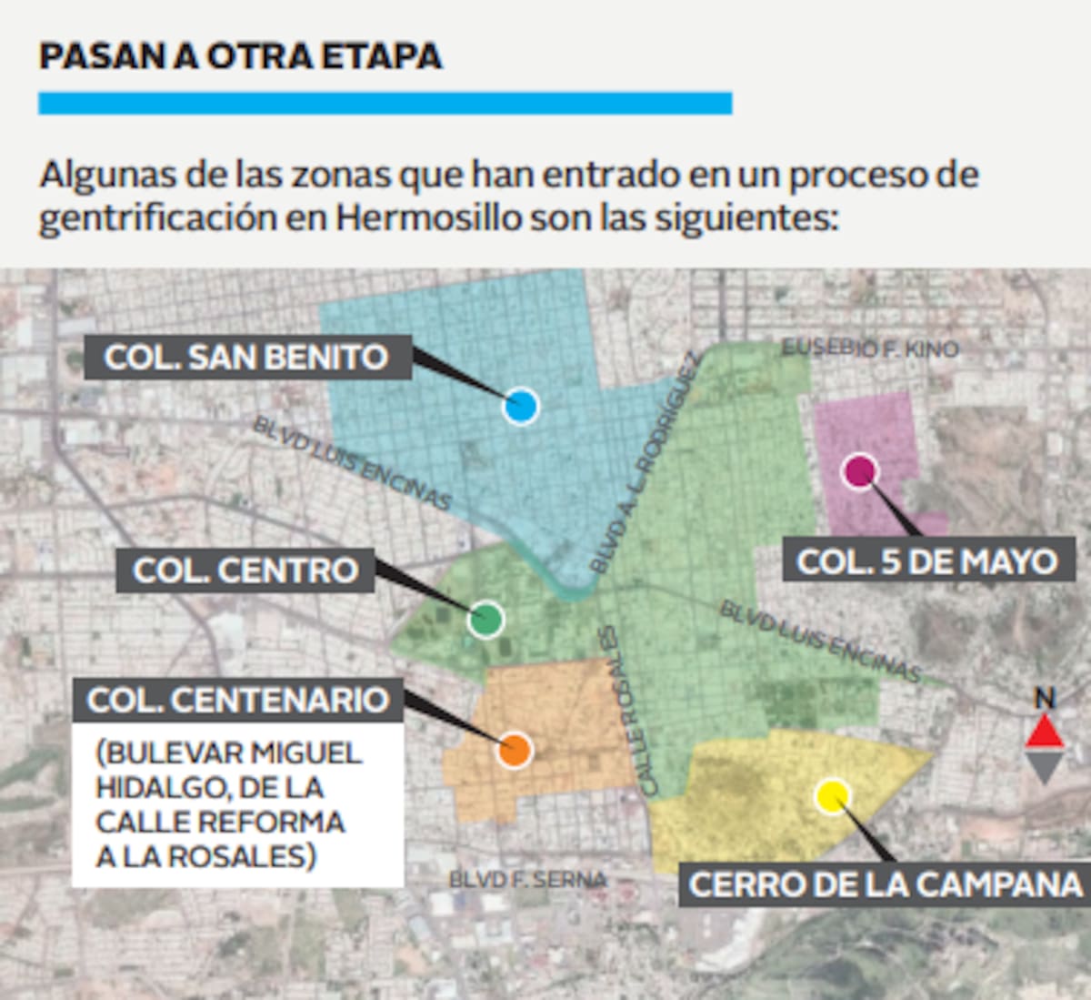 Indicóque en Hermosillo hay varios ejemplos de gentrificación, como el bulevar Hidalgo en la colonia Centenario, donde hay cafés y restaurantes, o la colonia 5 de Mayo, donde está el Parque La Ruina; en las que se ha cambiado la dinámica poblacional.