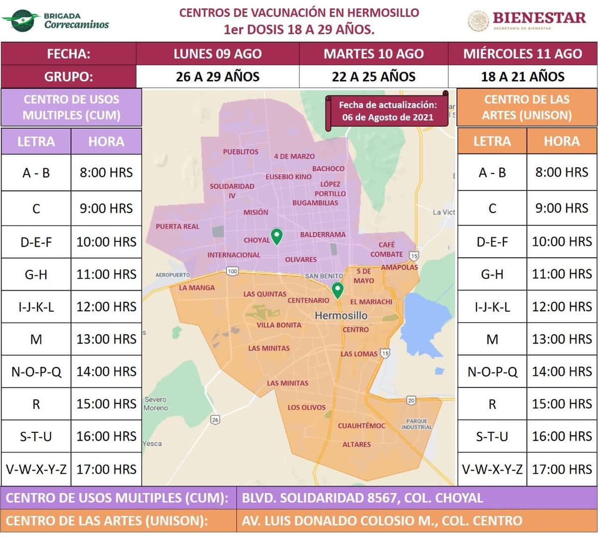 Les pedimos que no se desesperen, vamos a vacunar lunes (29 a 26 años), martes (22 a 25) y miércoles (18 a 21) en los dos puntos, en el norte en el Cum y sur de la ciudad en el Centro de las Artes de la Unison. Hay suficientes vacunas y si es necesario vamos a continuar jueves 12 y viernes 13 de agosto", dijo.