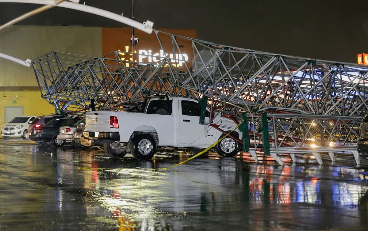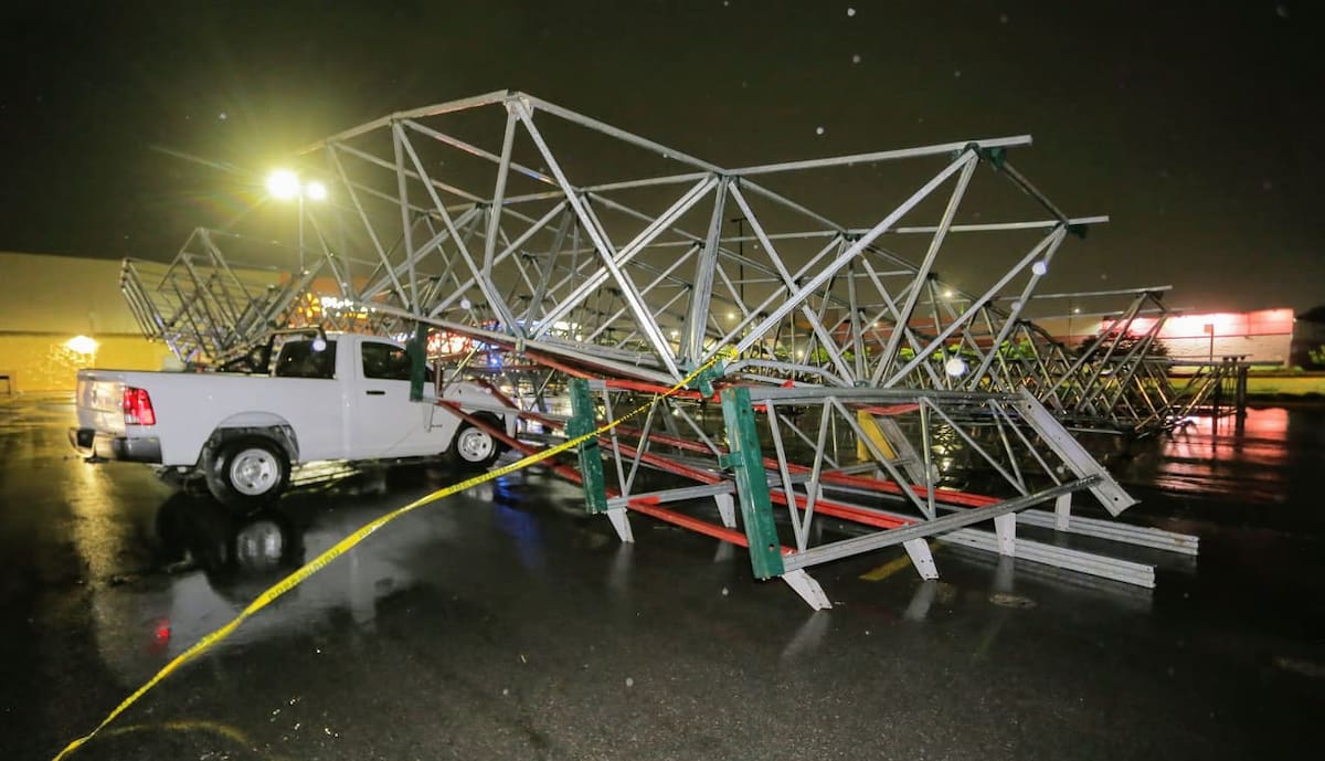 Viento tumba estructura en Walmart del Río y cae sobre autos