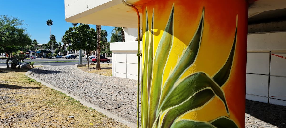 Con tan sólo 260 latas y pequeños botes de pintura para completarse, crearon en sus pilares pinturas de plantas y flores regionales, en los tres muros de una base será plasmado un coyote, una serpiente de cascabel y aves de Sonora.