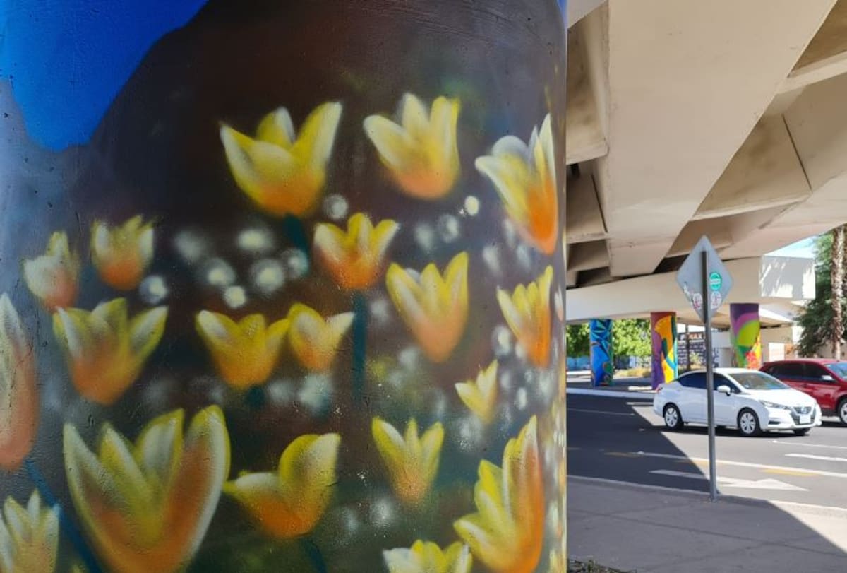 Integrantes del colectivo Sangre del Desierto embellecen los puentes viales del Estado de Sonora al pintar murales en ellos con diseños de flora y fauna de la región.