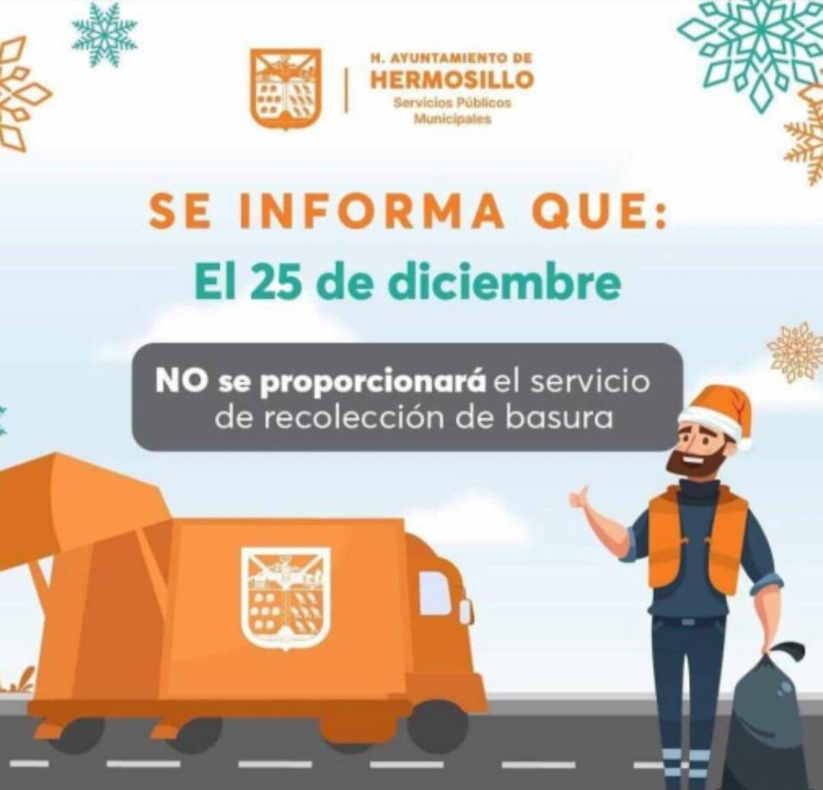 HERMOSILLO, Sonora.- El próximo sábado 25 de diciembre, en el sector Norte de la ciudad no se prestará el servicio de recolección de basura, informó el Ayuntamiento de Hermosillo por medio de sus redes sociales.