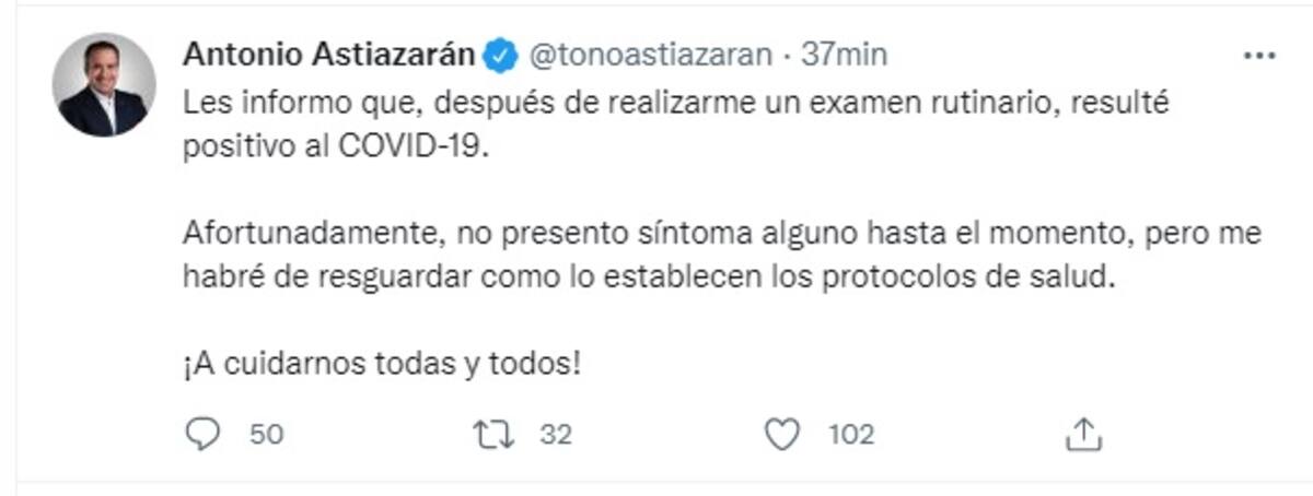 Les informo que, después de realizarme un examen rutinario, resulté positivo al Covid-19", reveló.