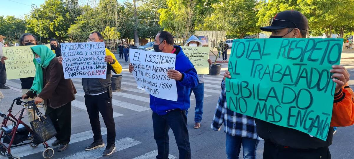 HERMOSILLO, Sonora.- Alrededor de 80 jubilados y pensionados del Ayuntamiento de Hermosillo bloquearon el bulevar Miguel Hidalgo frente a Palacio Municipal tras exigir la devolución de bono de vale de despensa .