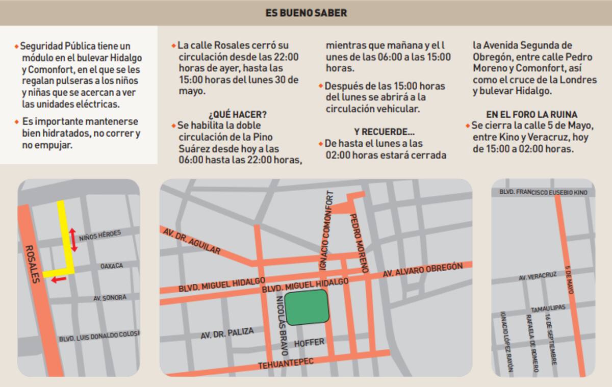 El día de sábado (hoy), se implementará doble circulación en la Pino Suárez, desde bulevar Luis Encinas a Oaxaca y ahí darán vuelta a la derecha para ingresar de nueva cuenta a la Rosales hacia el sector Sur”, explicó.