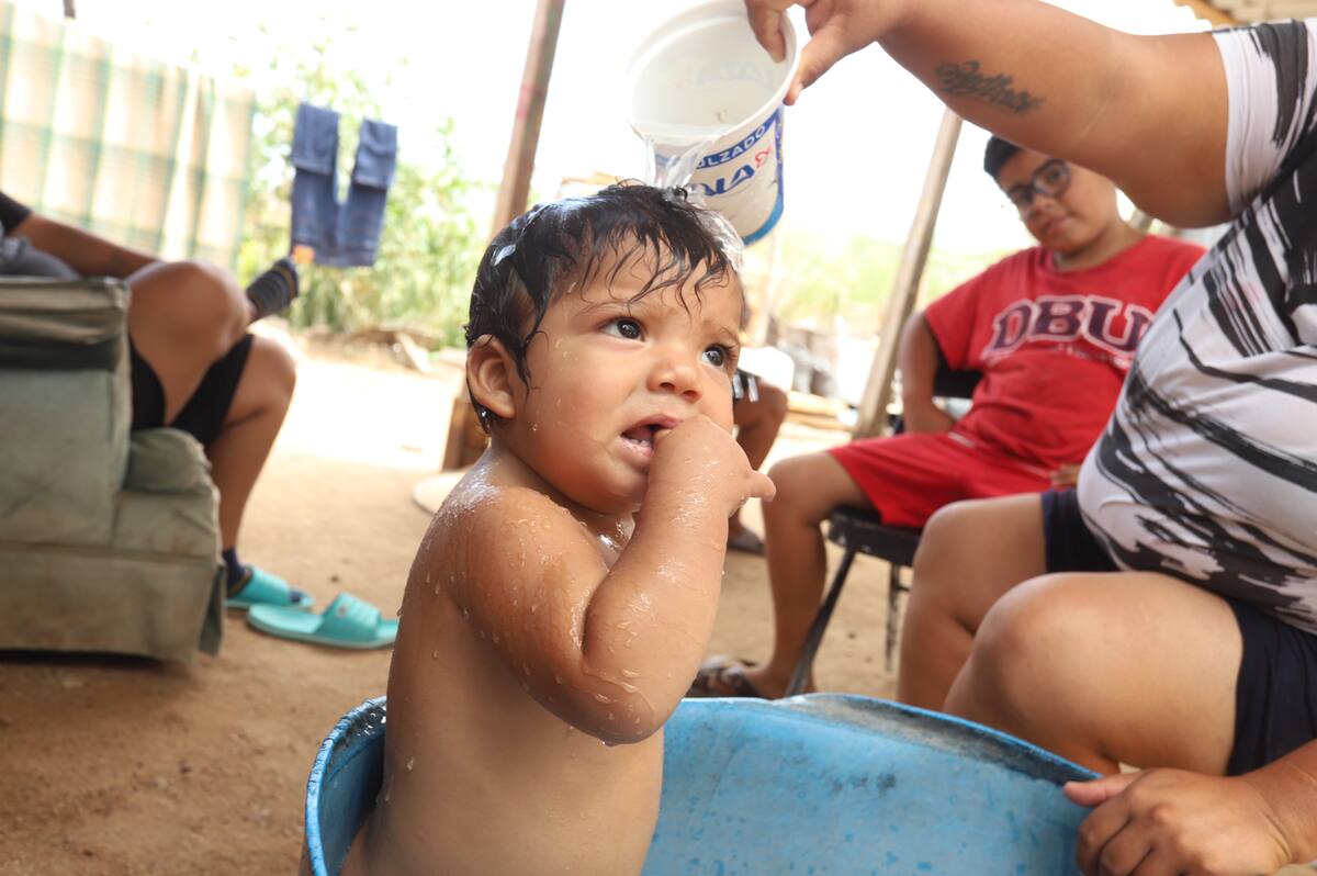 Michelle Aguayo mantuvo ayer al pequeño “Tilín”, de 10 meses de edad, en una tina con agua para que fuera más llevadero el día, ante las altas temperaturas.