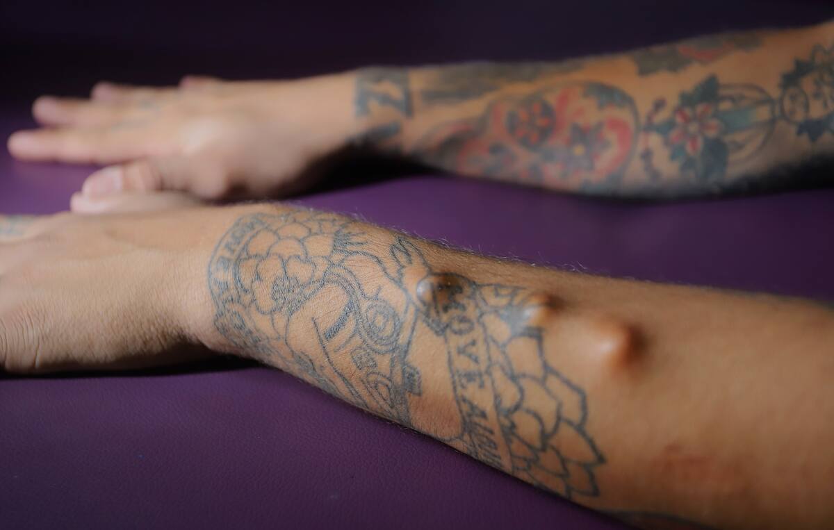 En su brazo izquierdo tiene implantes térmicos que colocó al interior de la piel, esto da un aspecto de “canicas” que están al interior del cuerpo separadas por una pulgada.
