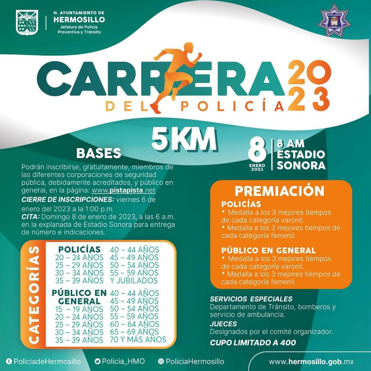 Mientras que la tradicional Carrera del Policía 2023 se llevará a cabo el domingo 8 de enero, en el circuito del Estadio Sonora, comenzando a las 8:00 horas.