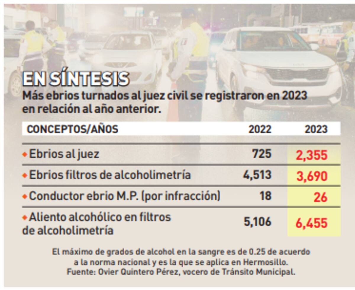 El número de personas con aliento alcohólico detectados el año pasado en los puntos de revisión aumentó en relación al 2022, al crecer de 5 mil 106 a 6 mil 455.