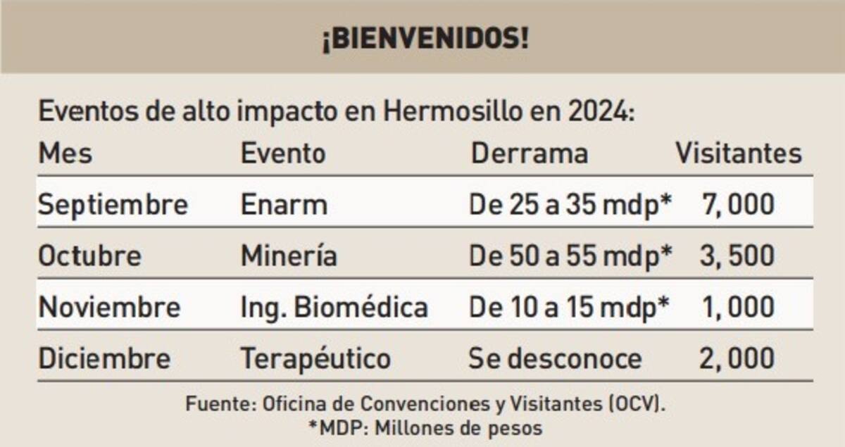Estamos a punto de amarrar un congreso internacional de innovación terapéutica para finales de noviembre y principios de diciembre que atrae cerca de 2 mil visitantes, tenemos una gran posibilidad de traerlo, no sabemos la derrama económica que genera porque es un evento nuevo para Hermosillo”, indicó.