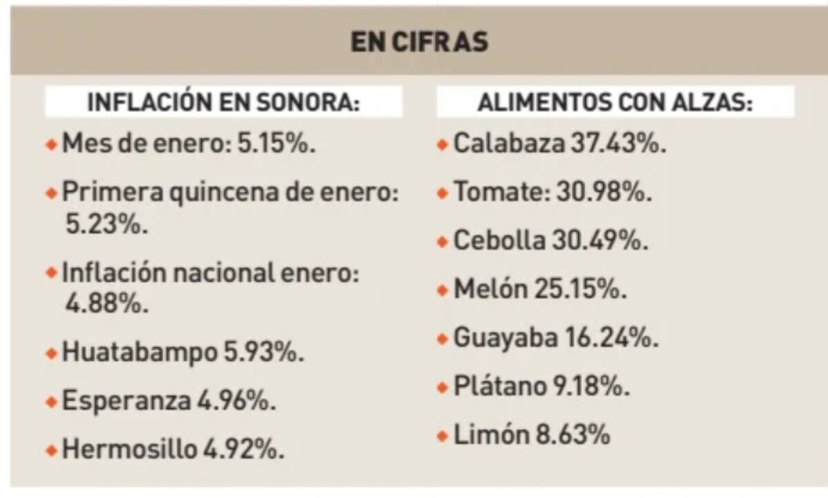 HERMOSILLO, Sonora.- La inflación en Sonora en enero registró una desaceleración al cerrar con un aumento de 0.69% con relación a diciembre de 2023, lo que fue inferior al 0.89% del promedio nacional.