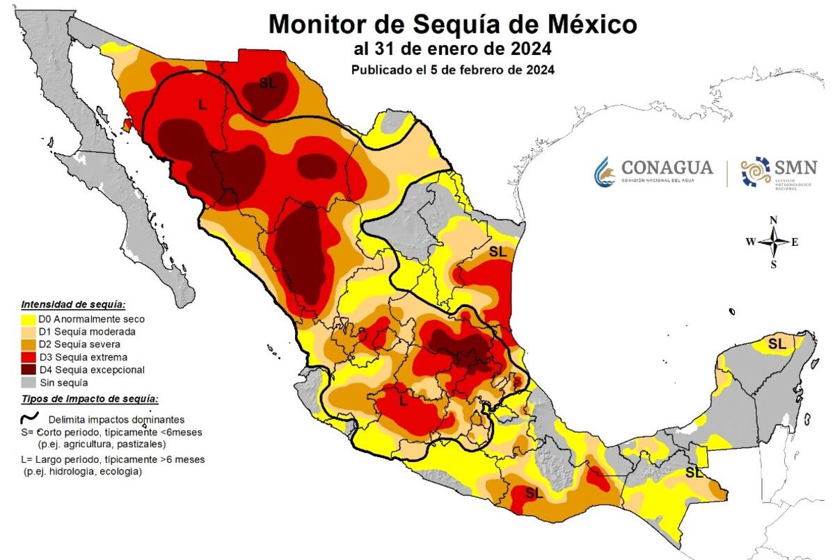 Al 31 de enero de 2024, la sequía se extendió a 16 municipios más que el año anterior, y el tipo de sequía alcanzó niveles de mayor alcance, pues dos municipios tenían sequía moderada, tres tenían sequía severa, 44 sequía extrema y 22 sequía excepcional.