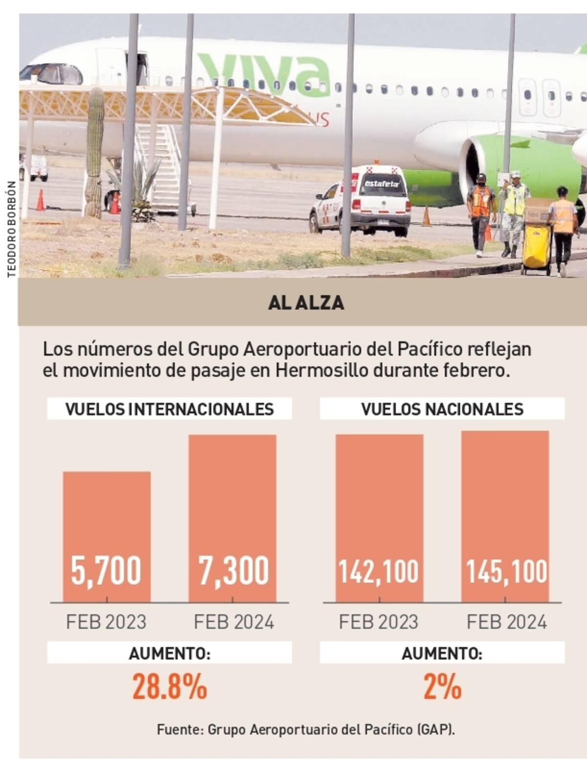 En los primeros dos meses de 2024, el aeropuerto de Hermosillo ha reportado una conexión aérea internacional de 16 mil 300 contra 12 mil 300 vuelos que tuvo en la misma fecha de 2023, lo que significa un incremento de 32.7%, superior al nacional que fue de 7%.