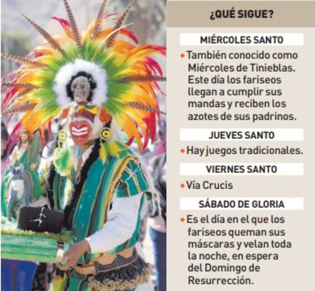 El Jueves Santo se realizan juegos tradicionales y el Viernes el Vía Crucis, el Sábado de Gloria la tradicional quema de máscaras para hacer la velación toda la noche y esperar la llegada del Domingo de Resurrección.