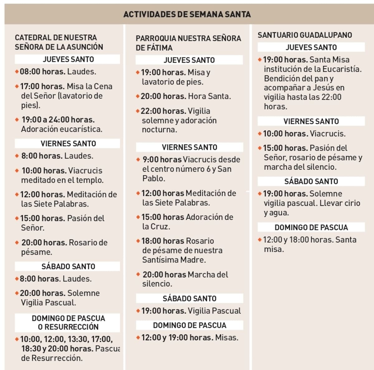 Cada templo tendrá sus distintos horarios para conmemorar la Pasión, Muerte y Resurrección de Cristo, siendo estos de los días más importantes para la Iglesia, los cuales iniciaron con el Domingo de Ramos.