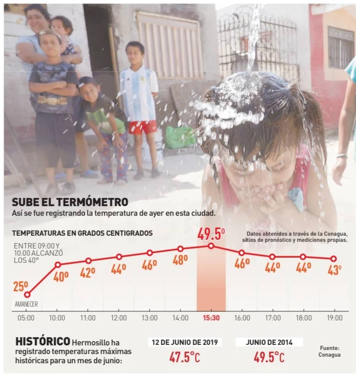 Publicaciones del 26 de junio del 2023 informan de una temperatura en la ciudad de entre 49.5 a 50°C proporcionada por Conagua y Protección Civil.