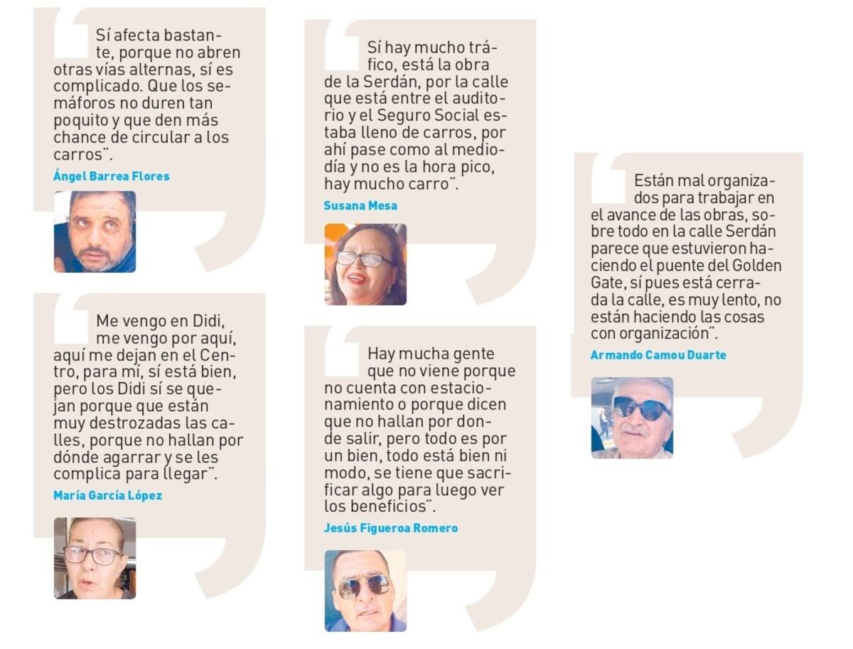 Están mal organizados para trabajar en el avance de las obras, sobre todo en la calle Serdán parece que estuvieron haciendo el puente del Golden Gate, sí pues está cerrada la calle, es muy lento, no están haciendo las cosas con organización”, consideró.