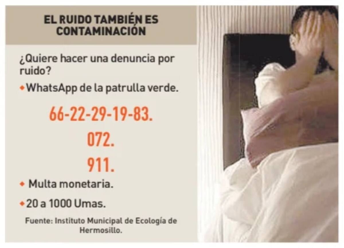 HERMOSILLO, Sonora.- El ruido que se genera desde el interior de un centro comercial o local de fiestas puede ser reportado al Instituto Municipal de Ecología (IME) debido a que hay una normativa que lo limita en el ambiente, informó Francisco Jesús Gil Barraza.
