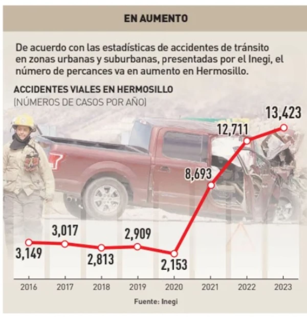 HERMOSILLO, Sonora.- El segundo lugar nacional en accidentes de tránsito ocupó Hermosillo en 2023, solamente superado por Monterrey, de acuerdo con las estadísticas que dio a conocer el Instituto Nacional de Estadística y Geografía (Inegi).