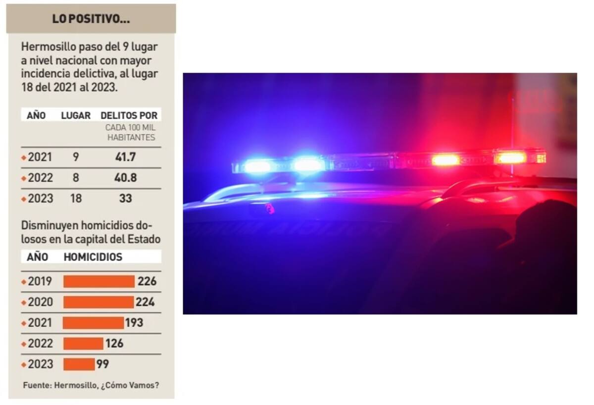 Urbina hizo énfasis en la Encuesta Nacional de Victimización y Percepción sobre Seguridad Pública 2023 del Inegi, que colocó a Hermosillo en la posición 17 de 34 entre las ciudades con menor incidencia delictiva (pasando de 40.8 a 33 delitos por cada 100 habitantes) y en el lugar 16 entre las ciudades con menor prevalencia delictiva que contempla el estudio.
