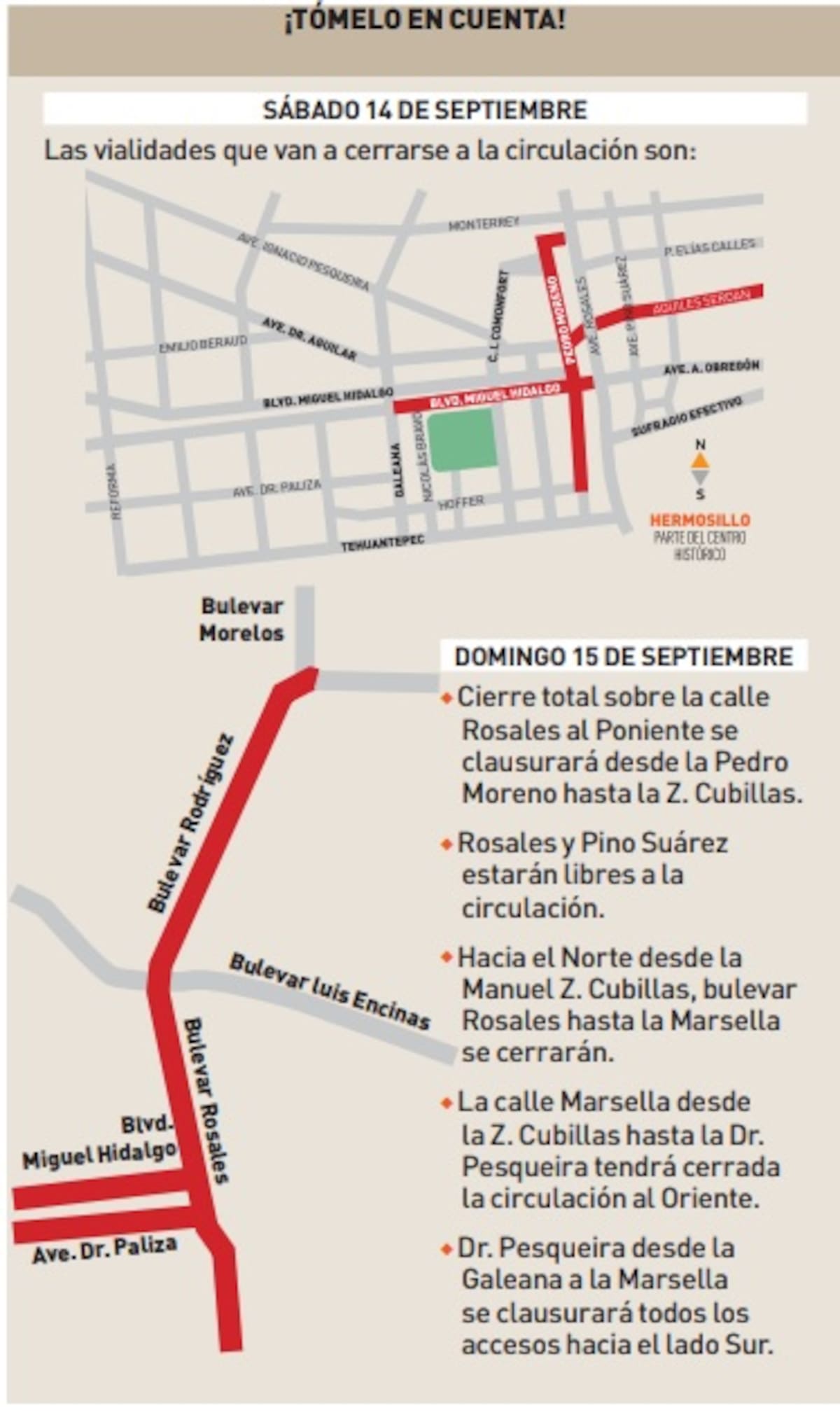 HERMOSILLO, Sonora.- El próximo fin de semana se celebrará el Día de la Independencia de México y la Policía Municipal adelantó que habrá cierres de calles en el primer cuadro de la ciudad.