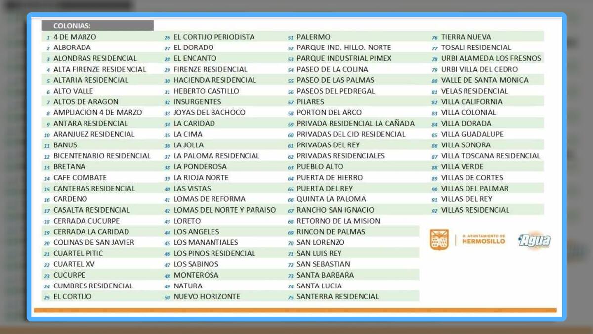 HERMOSILLO, Sonora.- Un total de 92 colonias del norte de la ciudad se verán afectadas este 5 de noviembre en el suministro de agua por obra, informaron autoridades de Agua de Hermosillo (Aguah).