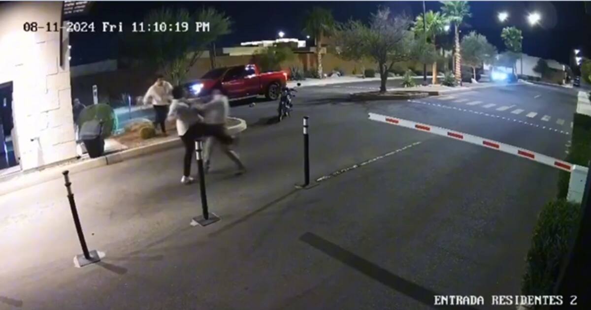 En un video registrado por la cámara de seguridad, ubicada en la entrada del complejo, se observa que un vehículo pick-up de color rojo y de aparente modelo reciente es detenido por un hombre que se encuentra a un lado de la caseta de vigilancia; cerca de él se encuentra una segunda persona y el guardia de seguridad que fue atacado segundos después.