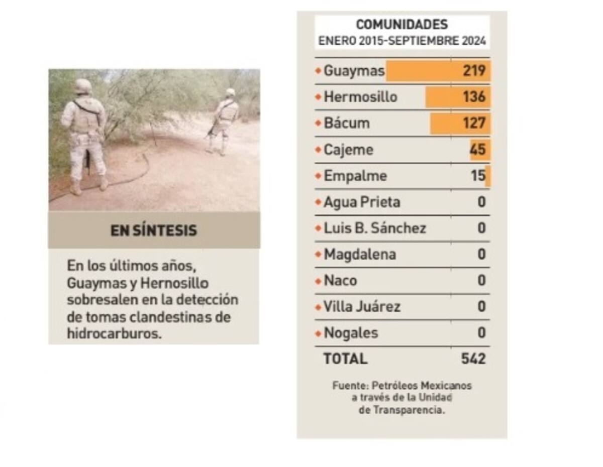 De acuerdo con información proporcionada por Petróleos Mexicanos, a través de la Unidad de Transparencia, en los últimos 10 años han localizado en Sonora 542 tomas clandestinas en los ductos de Guaymas, Hermosillo, Bácum, Cajeme y Empalme.
