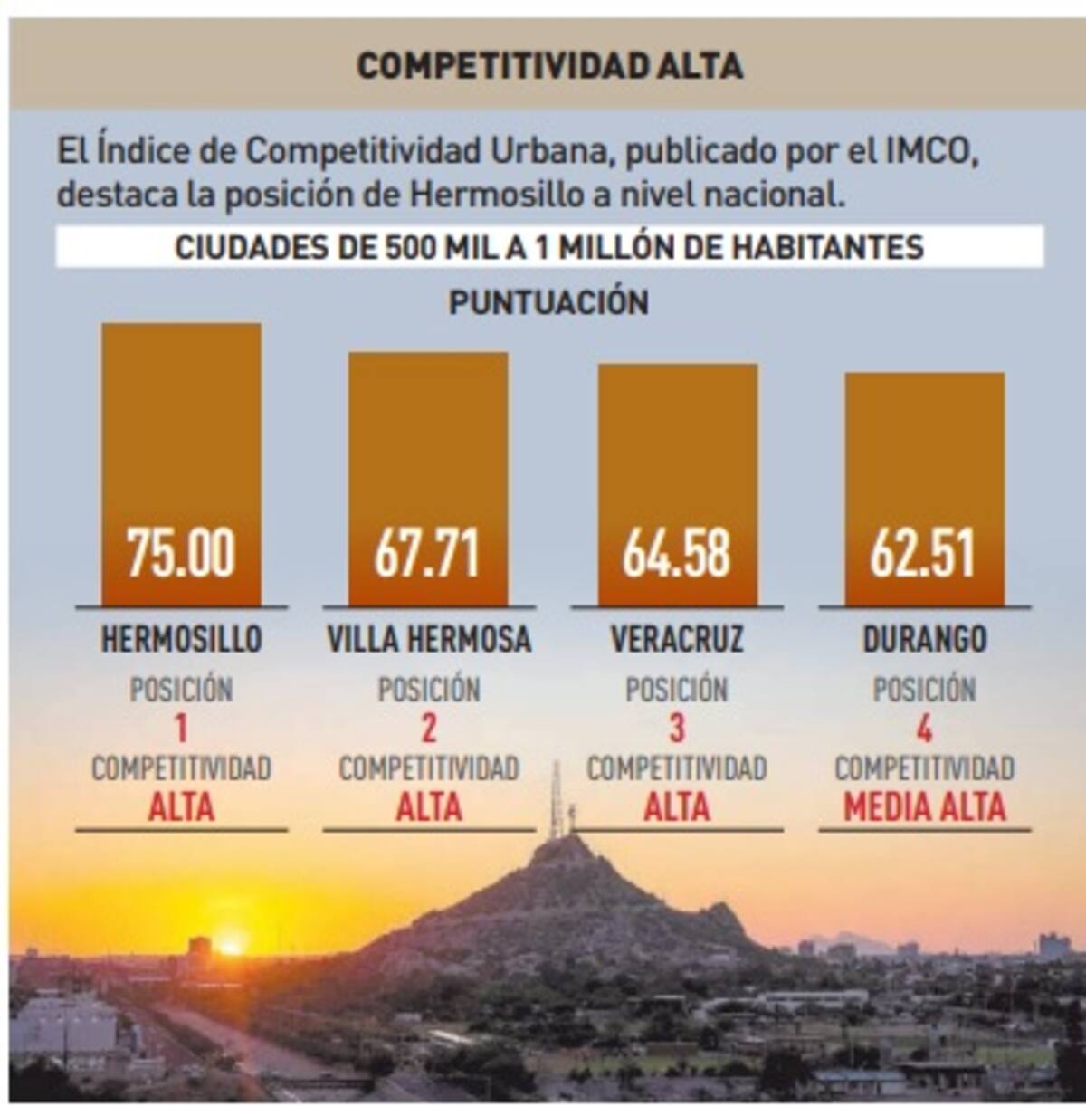 Hermosillo está en primer lugar en competitividad del País entre las ciudades de 500 mil a un millón de habitantes en el Índice de Competitividad Urbana (ICU) 2024, que realiza el IMCO.