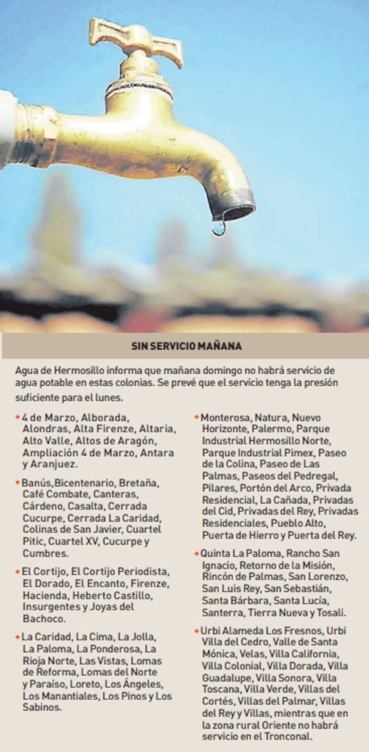 Hoy no habrá agua en estas 90 colonias del Norte de Hermosillo