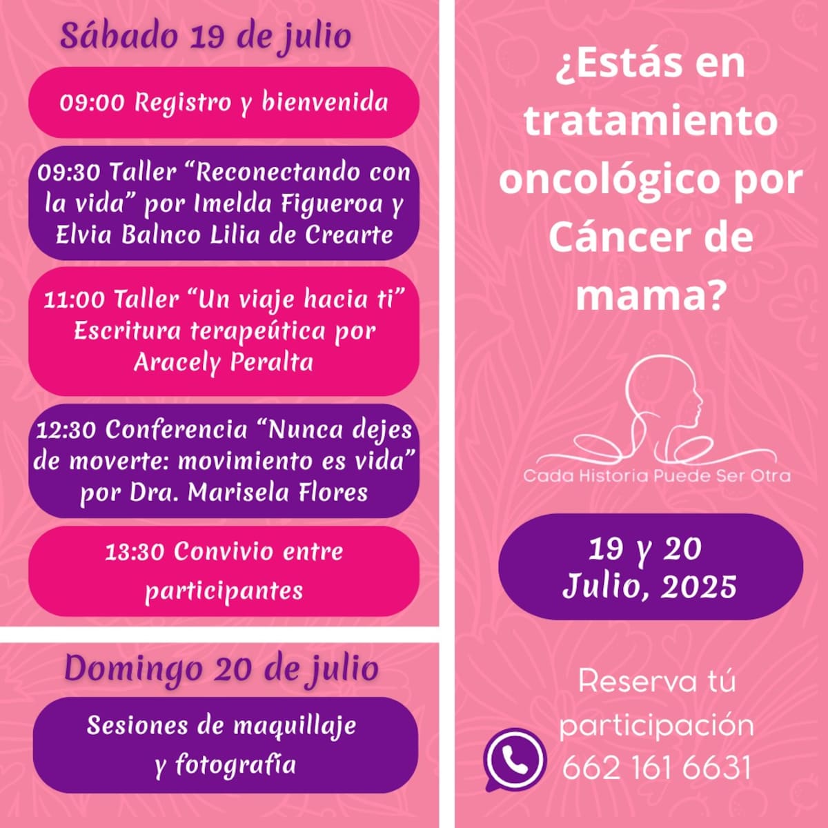HERMOSILLO.- El grupo “Cada Historia Puede Ser Otra” llevará a cabo su séptimo evento anual, enfocado en ofrecer talleres motivacionales gratuitos exclusivamente para mujeres pacientes oncológicas que están recibiendo quimioterapia o radiación como tratamiento contra el cáncer de mama.