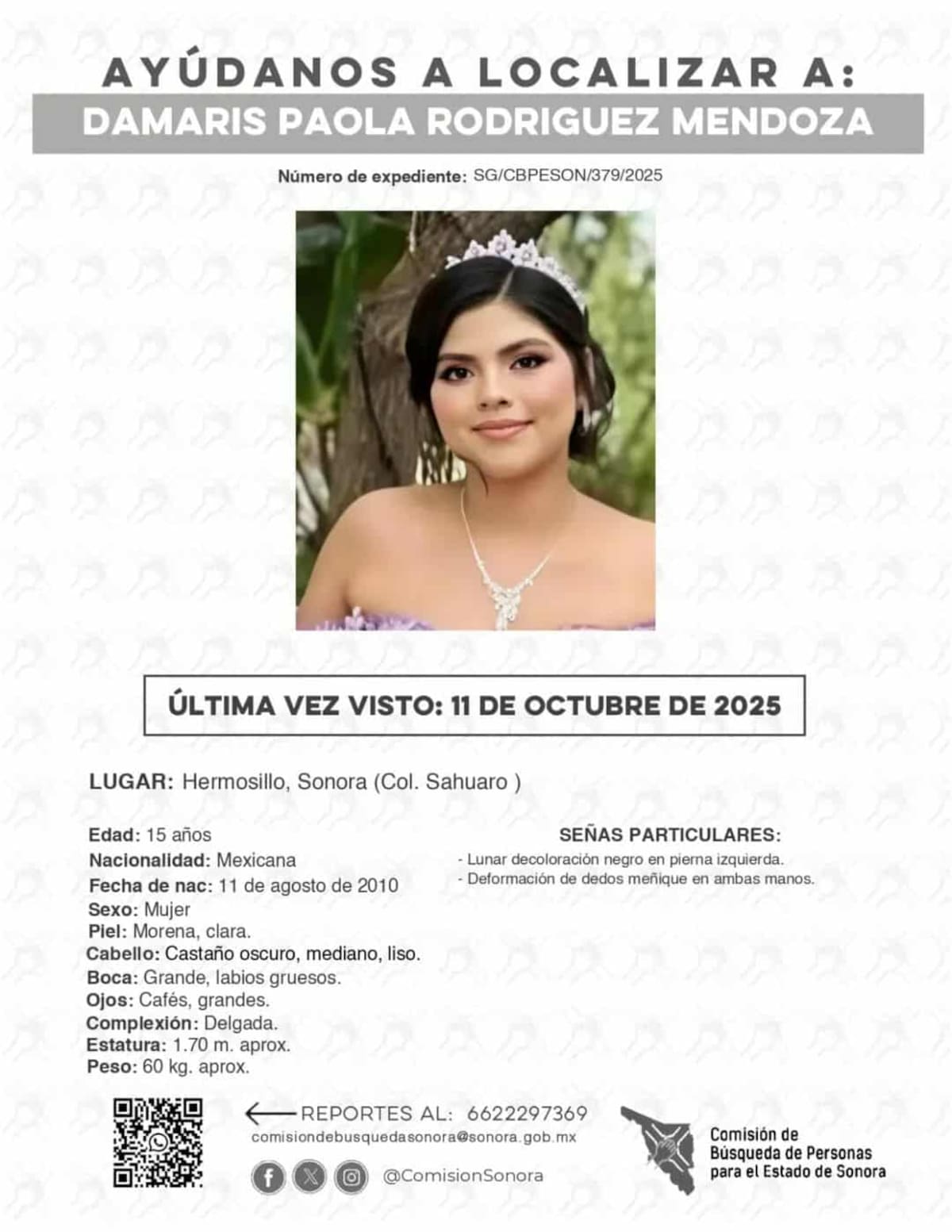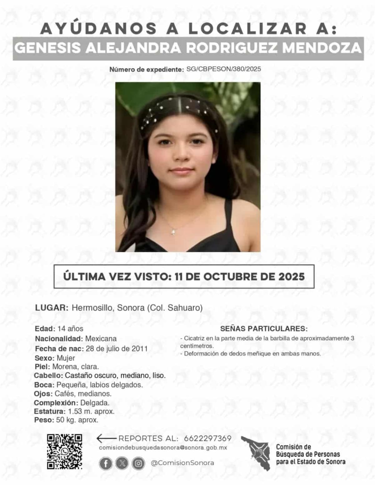 La Comisión de Búsqueda para el Estado de Sonora lanzó fichas de búsqueda para localizar a las hermanas Génesis Alejandra Rodríguez Mendoza de 14 años de edad y a Damaris Paola Rodríguez Mendoza de 15 años de edad.