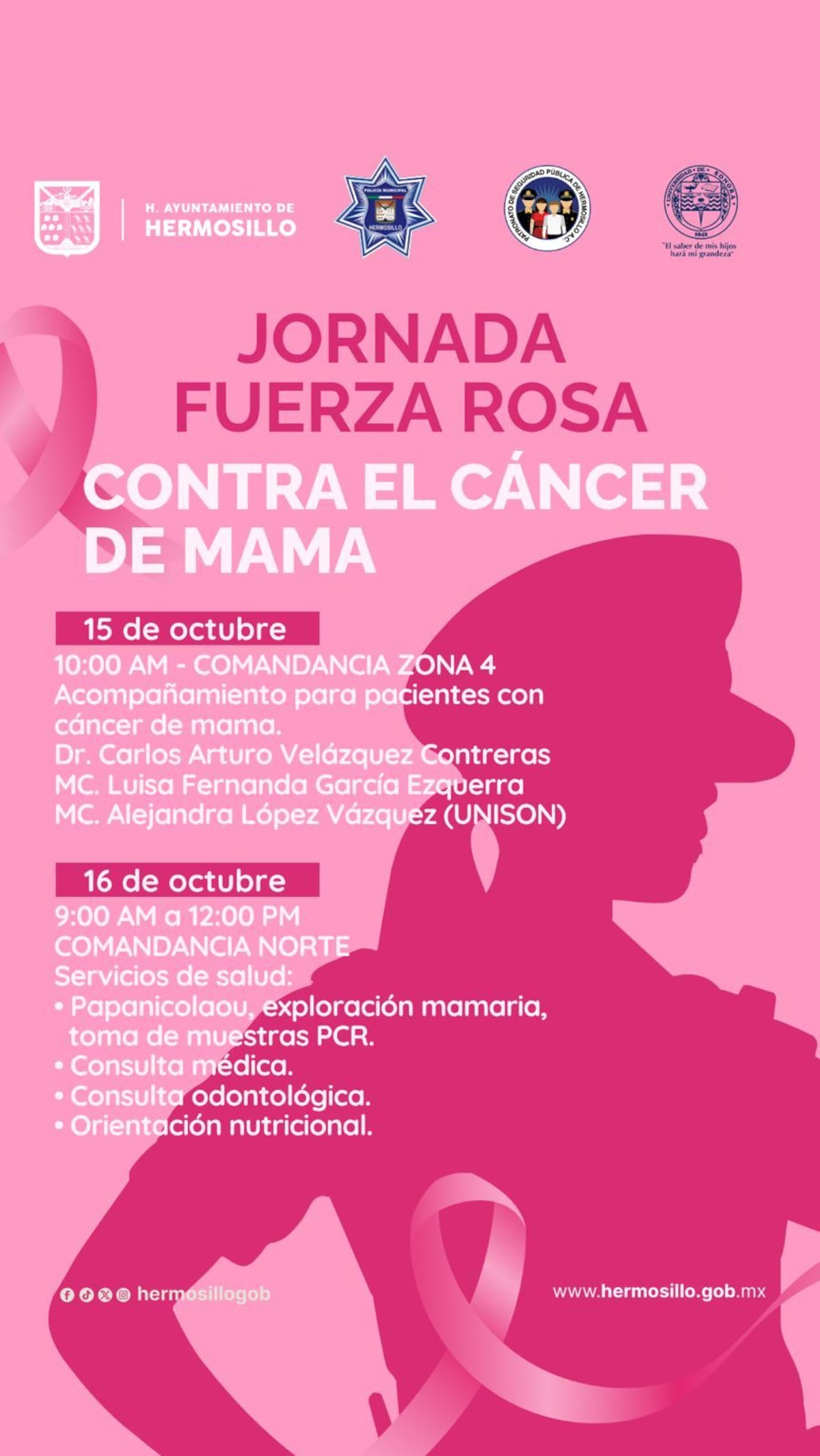La Policía Municipal de Hermosillo queremos sumarnos a las acciones preventivas y es por eso que llevaremos a cabo la segunda edición de la Jornada Fuerza Rosa en coordinación con el Patronato de Seguridad Pública, Salud Municipal y con la participación de la Universidad de Sonora”, dijo.
