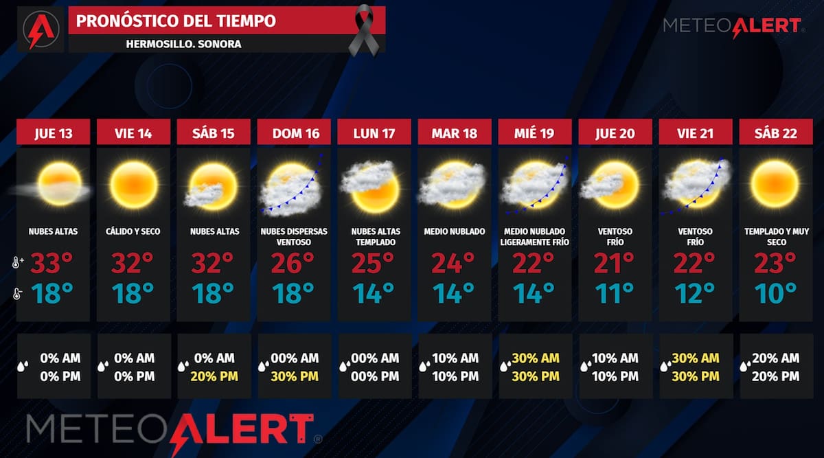 HERMOSILLO — El ingreso de un nuevo frente frío durante el fin de semana traerá un ligero descenso en las temperaturas y probabilidad baja de lluvias para Hermosillo, informó MeteoAlert Hermosillo.