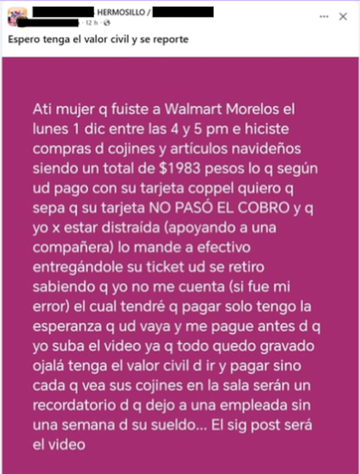 Post de Facebook sobre una clienta que presuntamente salió de Walmart Morelos sin pagar casi dos mil pesos generó gran debate y fue eliminado antes de conocerse el desenlace.