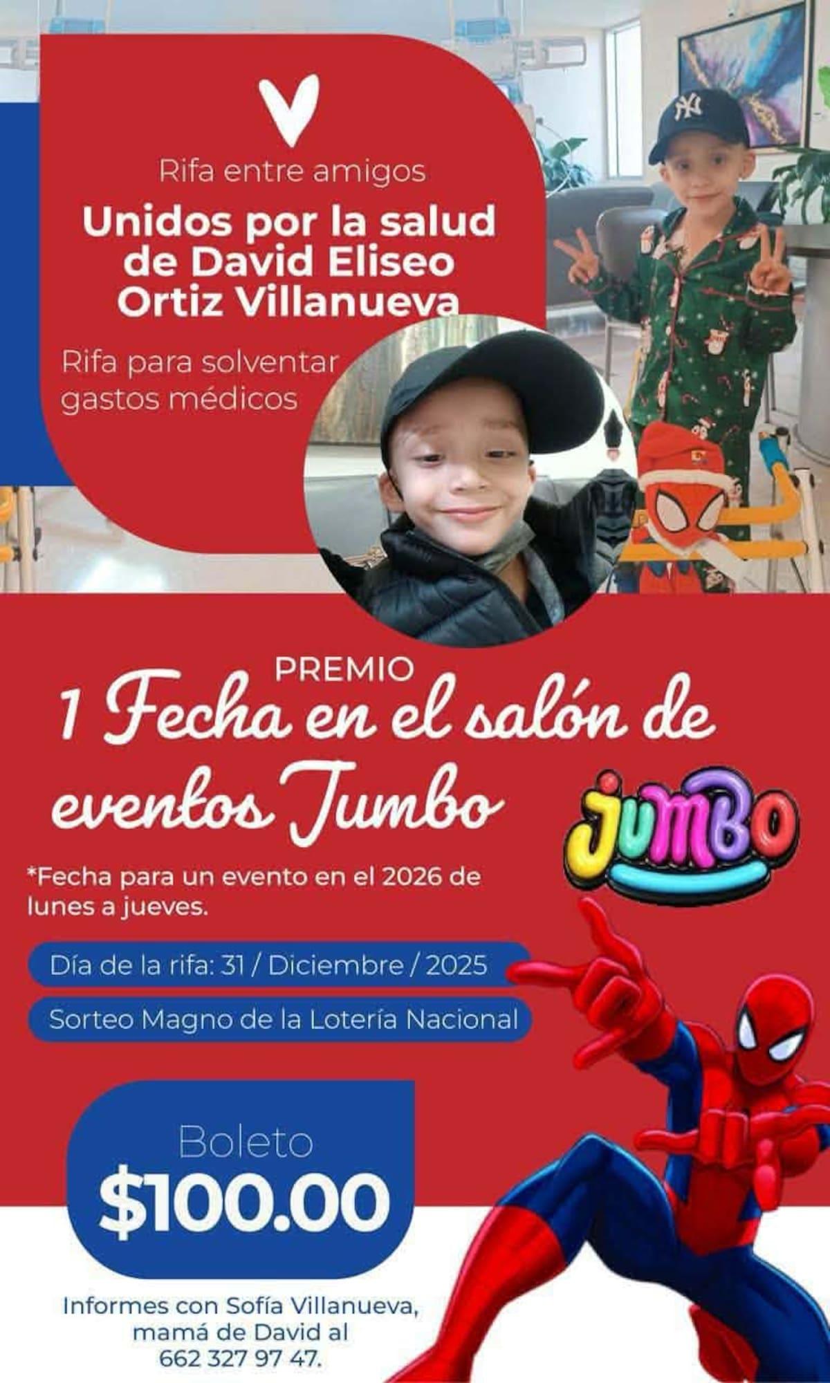Por eso, como parte de las actividades para recaudar fondos, se realiza una rifa solidaria, de la renta de un local de fiestas, cuyo boleto tiene un costo de 100 pesos, y todos los recursos serán destinados a cubrir gastos médicos, necesarios para continuar con la atención del menor.