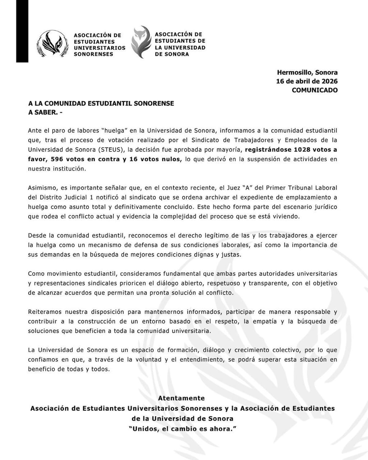 Tras la votación a favor de la huelga por parte del Steus, que derivó en el paro de labores, la Asociación de Estudiantes Sonorenses y la Asociación de Estudiantes de la Universidad de Sonora exhortaron a privilegiar el entendimiento.