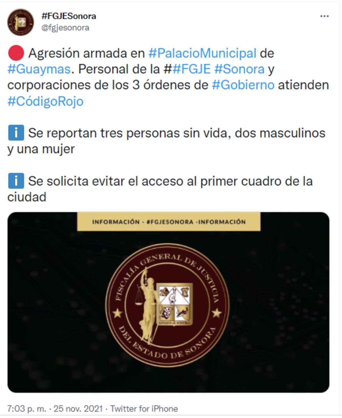 Además se informó que en el ataque murieron tres personas, dos hombres y una mujer, por lo que se activó el Código Rojo y hubo despliegue de personal de la FGJE Sonora y corporaciones de los 3 órdenes de Gobierno.