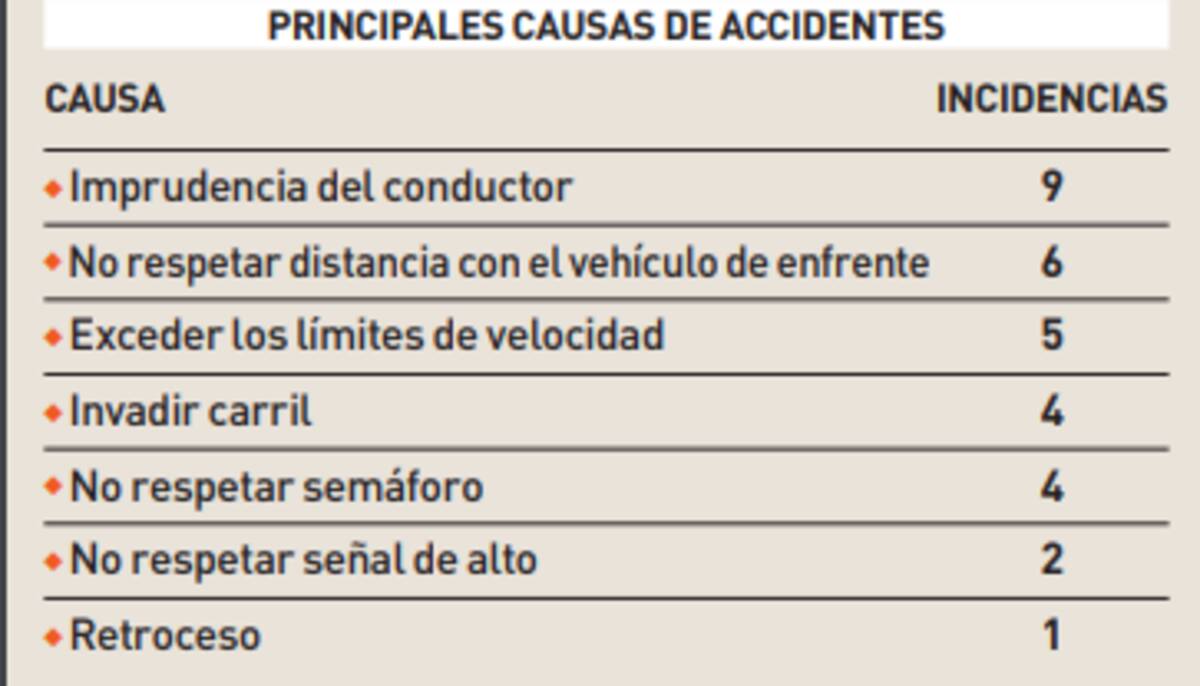 Arvizu Quintero explica en el texto que las principales causas del total de accidentes viales presentados la semana pasada fueron la imprudencia del conductor, el no respetar distancia con el vehículo de enfrente, exceder velocidad, invadir carril, no respetar la luz roja del semáforo, no respetar la señal de alto y retroceso.