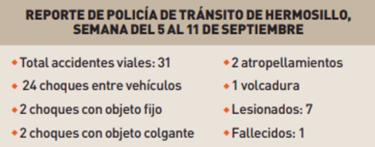 En el boletín que Seguridad Pública de Hermosillo emitió se indica que en la semana que comprende del 5 al 11 de septiembre de 2022, la Policía de Tránsito registró 31 hechos viales, dos menos que la semana anterior. Ramón Manuel Arvizu Quintero, encargado del Dispositivo de Tránsito para una Movilidad Segura e Incluyente (Ditam), declaró en el informe compartido por la corporación que del total de estos hechos, 24 fueron choques entre vehículos, dos choques con objeto fijo, dos choques con objeto colgante, dos atropellamientos y una volcadura.