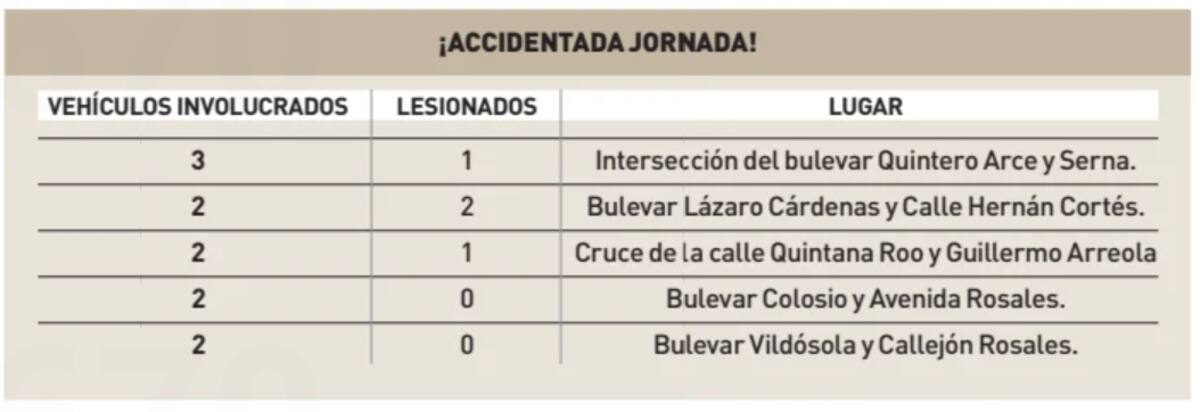 HERMOSILLO, Sonora.- Al menos cinco accidentes de tránsito que involucraron once vehículos y dejaron un saldo de cuatro personas lesionadas se registraron ayer en diferentes puntos de la capital sonorense.