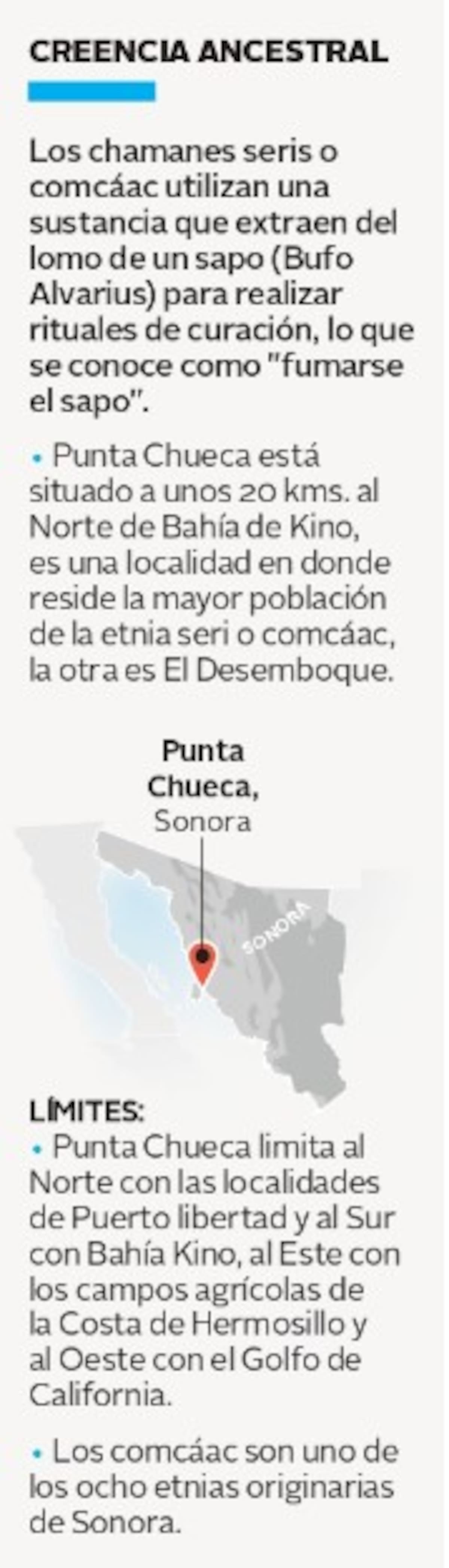 Raymundo es más conocido como “Ray” en Punta Chueca, una comunidad indígena donde habitan los comcáac (seris) ubicada a unos 140 kilómetros de la ciudad de Hermosillo en el Norte de México. Él dice que el “sapito” tiene la molécula del espíritu.