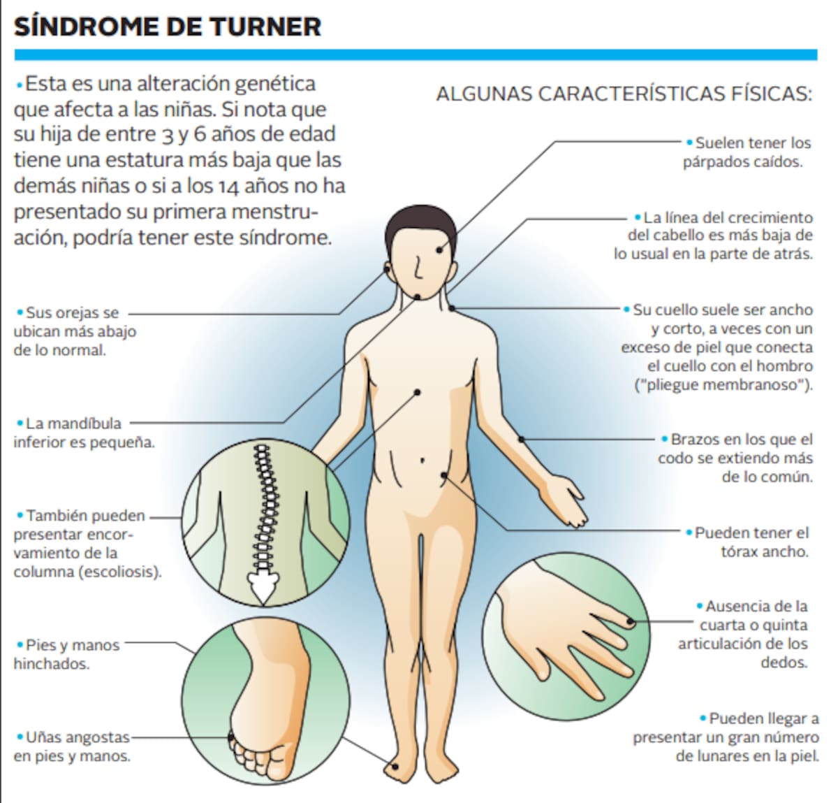 El síndrome de Turner es la ausencia total o parcial de un cromosoma X en las células de las niñas, afecta a una de cada dos mil y entre las principales características físicas se encuentran la baja estatura y la ausencia de menstruación.