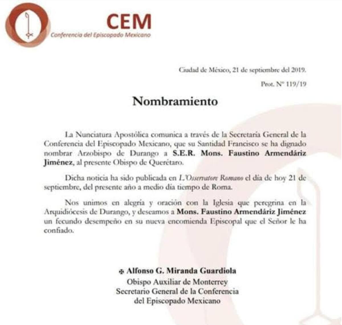 “Nos unimos en alegría y oración con la Iglesia que peregrina en la Arquidiócesis de Durango, y deseamos a monseñor Faustino Armendáriz Jiménez un fecundo desempeño en su nueva encomienda episcopal que el Señor le ha confiado”, expone la CEM en su boletín de prensa.